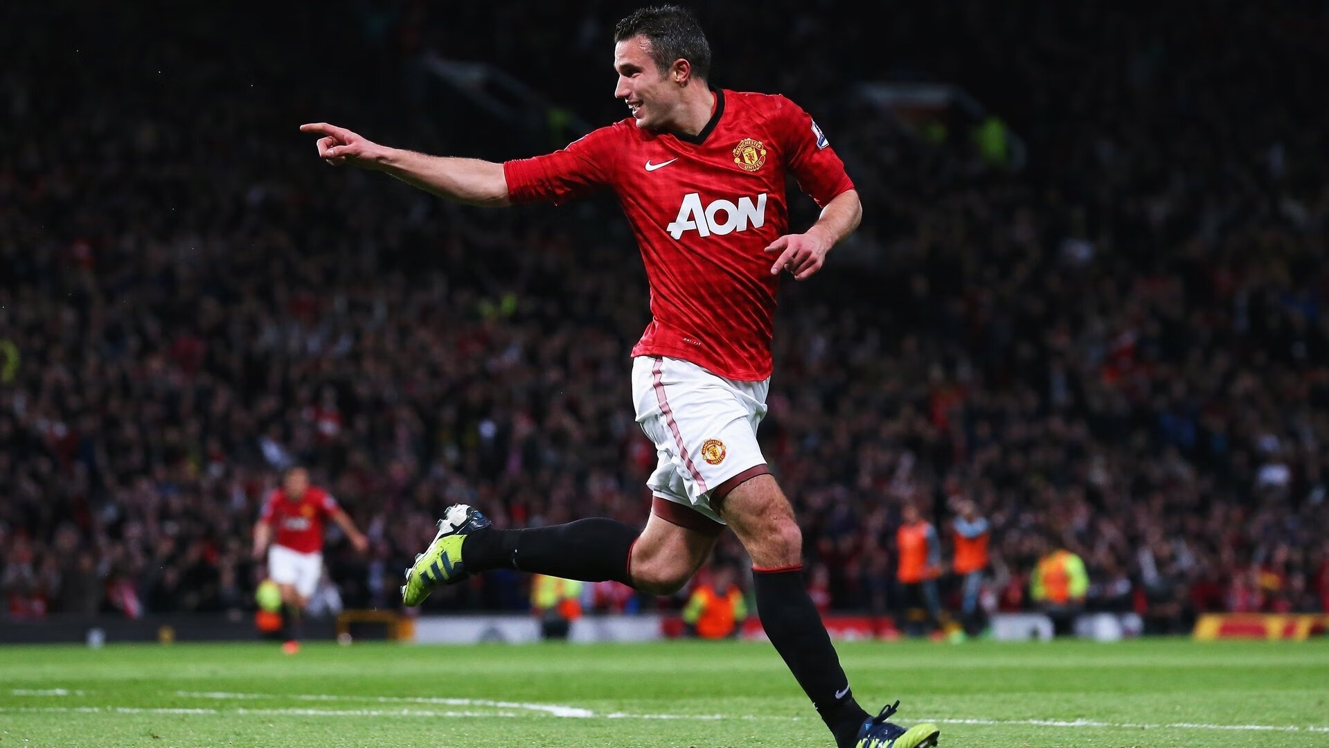 球迷们在看台上挥舞旗帜,呐喊声在球场上空回荡。